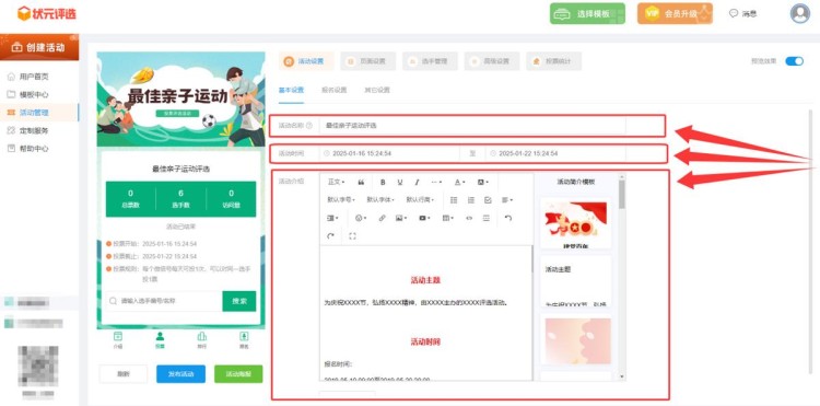 其次,在【活动设置】页面,修改活动名称、设置活动起止时间、编辑活动介绍。