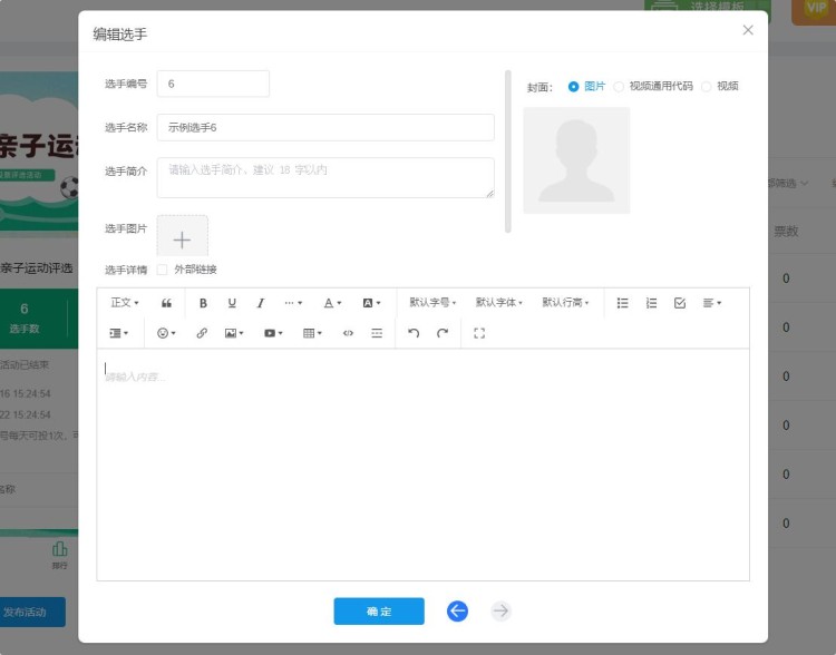 然后,在【选手管理】中,上传所有选手的个人资料,包括选手名称、简介、照片或者视频等。