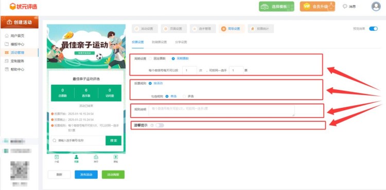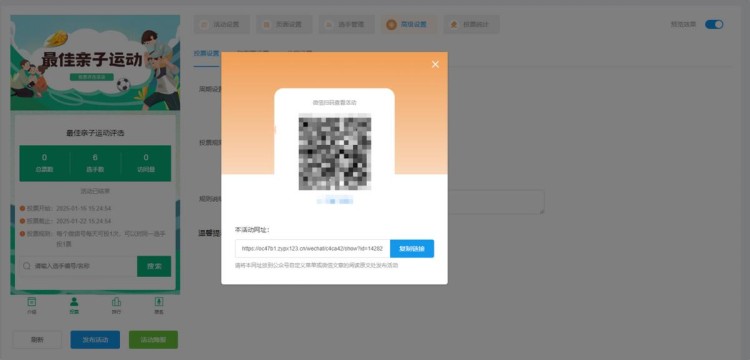 最后。当各项设置后,只需轻点页面上醒目的【发布活动】按钮,系统将瞬间自动生成专属的投票链接以及方便快捷的二维码。此时,一场微信投票评选活动就制作完成了。整个流程轻松流畅,简单几步,即可开启精彩投票之旅,是不是超乎想象的简单?