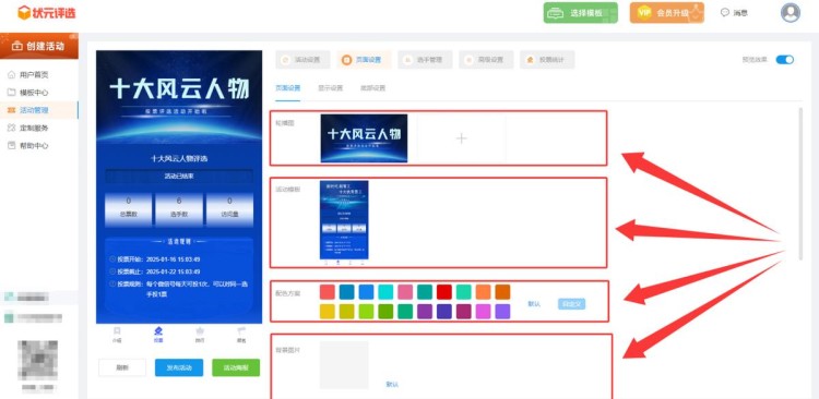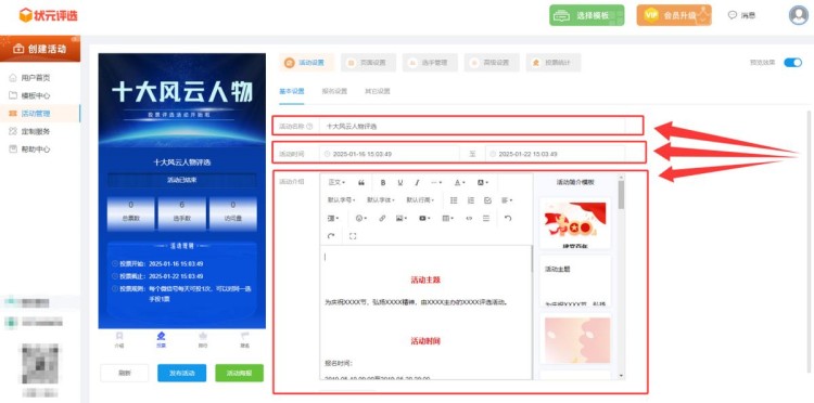 其次,在【活动设置】中,修改活动名称、设置活动开始和结束的时间、编辑活动介绍(包括活动名称、简介、评选标准、奖项设置等)。