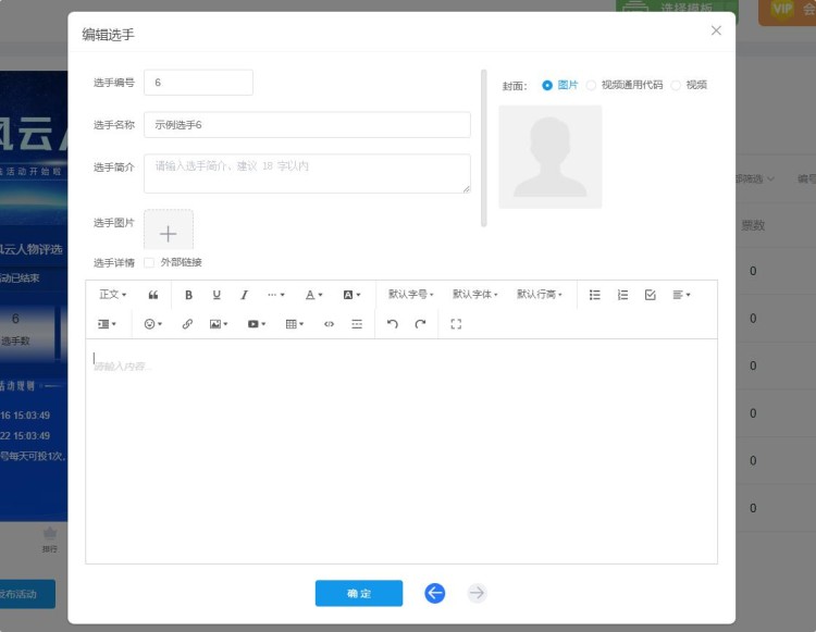 然后,在【选手管理】中点击【添加选手】或者【示例选手】,上传所有选手的个人资料,包括选手名称、简介、照片或者视频等。
