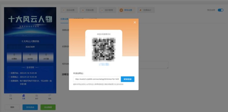最后,上述步骤完成,且检查无误后,点击【发布活动】,系统会自动生成投票链接和二维码。复制链接,可嵌入到公众号文章或菜单栏当中。这样一场公众号投票评选活动就已经制作完成了,是不是很简单?