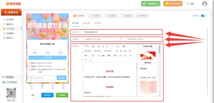 第二步,在【活动设置】中,依次编辑活动名称,敲定活动时间,撰写活动简介,让活动信息完整呈现,为后续推进筑牢根基。