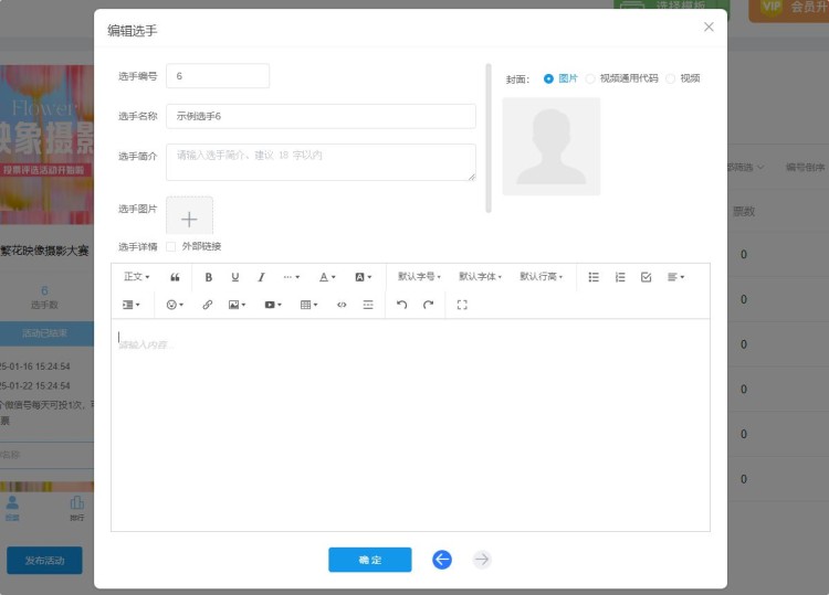 第四步,在【选手管理】中,上传所有选手的个人资料,包括选手的名称、编号、简介、照片或者视频等。