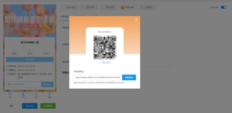第六步,上述步骤完成后,且检查无误,点击【发布活动】,系统会自动生成投票链接和二维码。这样一场网络投票就制作完成了,是不是很简单?