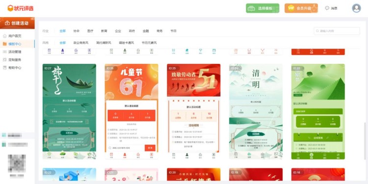其次,完成账号的注册登录后,系统会自动跳转至活动后台,点击进入【模板中心】板块,可以看到各式各样的模板,选择合适的一键套用。