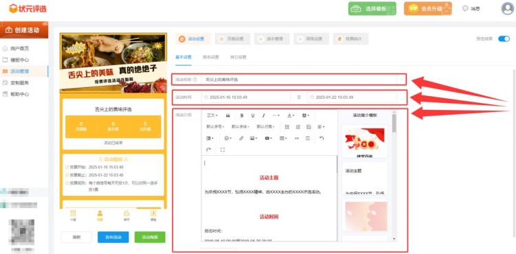 再者,在【活动设置】中,编辑活动信息,包括活动名称、时间、简介。