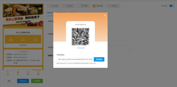 最后,上面这些都做完,且仔细检查,确定没有问题后,点击【发布活动】,系统会自动生成投票链接和二维码。这样一场微信投票活动就制作完成了,是不是很简单?