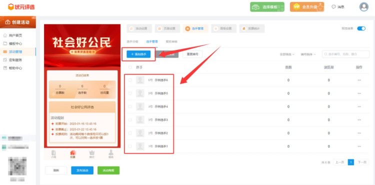 在【选手管理】中,上传所有选手的个人资料,包括选手的名称、简介等。
