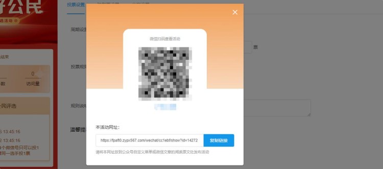 点击【发布活动】,系统会自动生成投票链接和二维码。这样社会好公民网络投票评选活动就制作完成了,您学会了吗?
