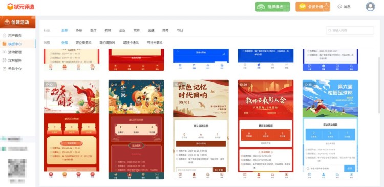 注册登录后,系统会自动跳转至活动后台,在【模板中心】,可以看到各式各样的模板,选择合适的一键套用即可。