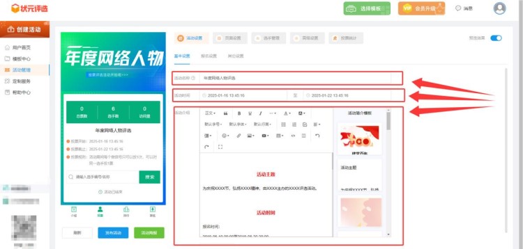活动设置:将活动名称改为年度网络人物评选,并设置活动开始和结束的时间、编辑活动介绍。