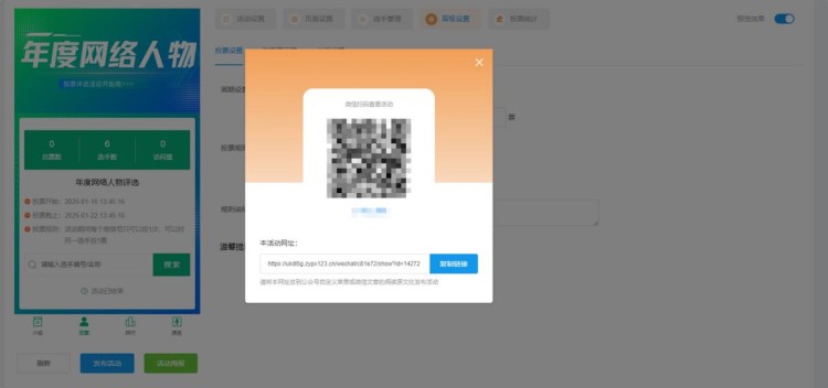 上述步骤完成后,点击【发布活动】,系统会自动生成投票链接和二维码。这样年度网络人物微信评选活动就制作完成了,是不是很简单?