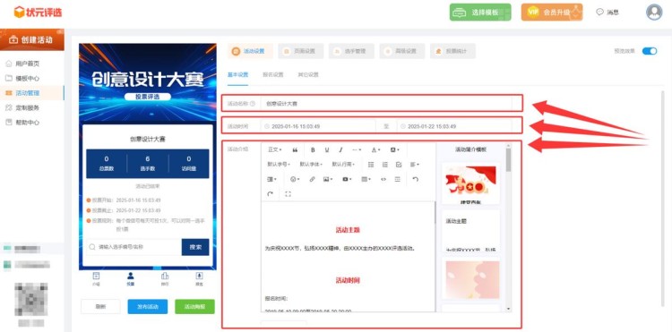 其次,在【活动设置】中,编辑活动信息,包括活动名称、时间、简介。