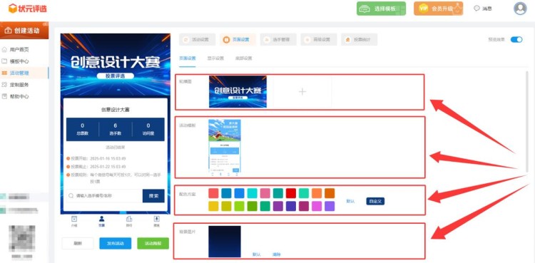 首先,随便打开电脑上哪个浏览器,在百度中搜索状元评选,进入平台首页后,右上角点击【注册】按钮,输入手机号、验证码等信息,注册账号。老用户直接登录即可。登录后,系统会自动跳转至活动后台,在【模板中心】,选择模板样式。