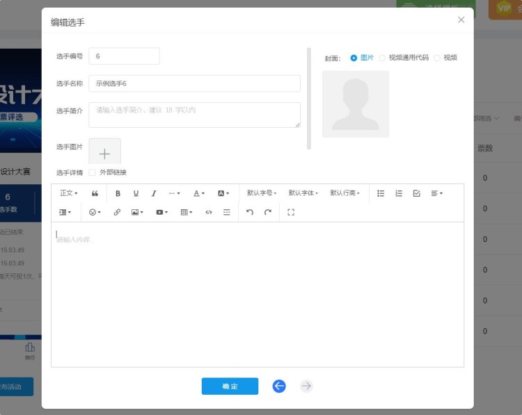 然后,在【选手管理】中,上传所有选手的个人资料,包括选手名称、简介等。