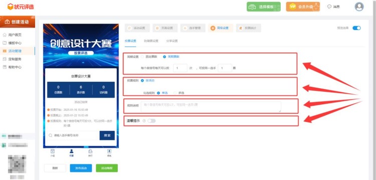 再然后,在【高级设置】中,完成投票规则的设置。