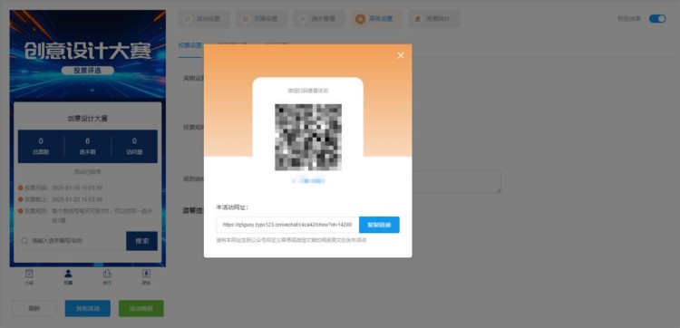 最后,上面这些步骤都完成,且仔细检查确定没有问题之后,点击【发布活动】,系统会自动生成投票链接和二维码。这样一场微信投票活动就制作完成了,是不是很简单?