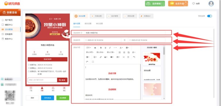 再者,在【活动设置】中,编辑活动信息,包括活动名称、时间、简介等。