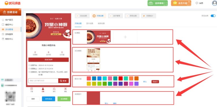 接下来,在【页面设置】中,上传主题轮播图,并根据活动需要,完成其他页面设置上的操作,如添加背景音乐、漂浮物等。