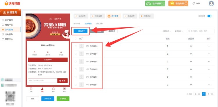 然后,在【选手管理】中点击【示例选手】或者【添加选手】,上传所有选手的个人资料。