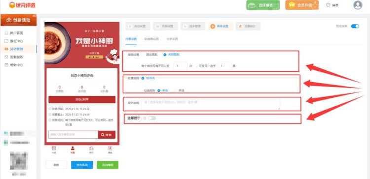 再然后,在【高级设置】中,设置投票规则,如活动期间,可以给几名选手投票、又能投几票等。