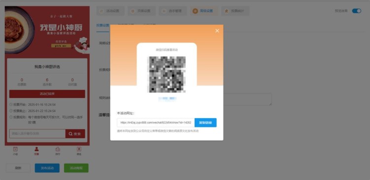 最后,点击【发布活动】,系统会自动生成投票链接和二维码。将其保存下来并分享出去,即可开启微信评选活动,选出最终的获胜者。