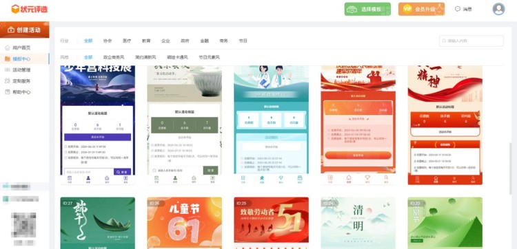 第二步,注册登录后,系统会自动跳转至活动后台,点击【模板中心】,可以根据活动主题与您的喜好,选择相契合的模板,如创业之星、知识产权十大事件等。