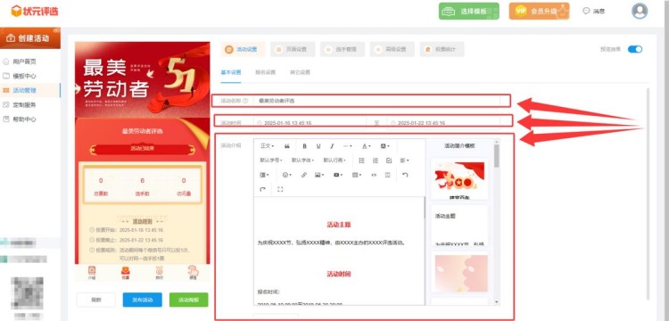第三步,在【活动设置】中,修改活动名称,如最美劳动者评选等,并设置活动开始和结束的时间。以及编辑活动介绍。