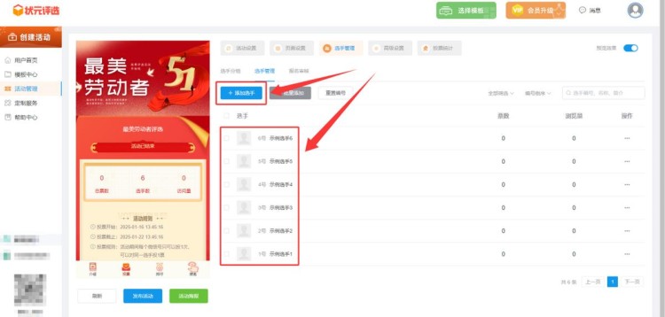 第五步,在【选手管理】中点击【添加选手】或者【示例选手】,上传所有选手的个人资料,包括选手的名称、简介等。