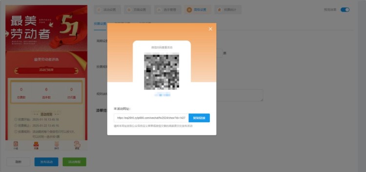 第七步,上述步骤完成,且仔细检查确定无误后,点击【发布活动】,系统会自动生成投票链接和二维码。这样一场与劳动节相关在线评选活动就制作完成了,是不是很简单?