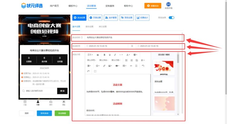 在【活动设置】中,将活动名称改为电商创业大赛创意短视频评选,并设置活动开始和结束的时间、编辑活动介绍。