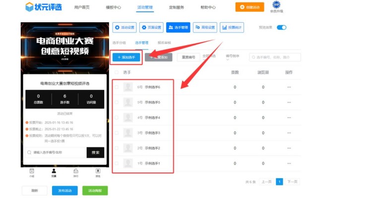 在【选手管理】中,上传所有选手的个人资料,包括选手的名称、简介、照片或者视频等。