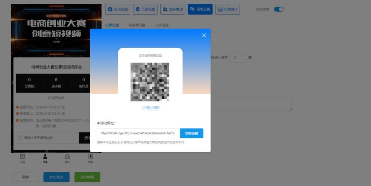 第七步,点击【发布活动】,系统会自动生成投票链接和二维码。这样电商创业大赛创意短视频网络投票评选活动就制作完成了,您学会了吗?