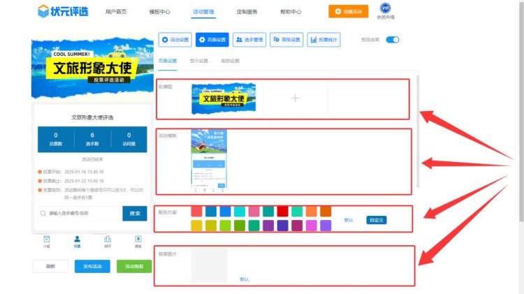 第四步,在【页面设置】中,上传所有选手的个人资料,包括选手的名称、简介、照片或者视频等。