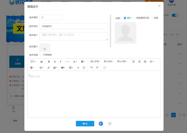 第五步,在【选手管理】中,上传所有选手的个人资料,包括选手的名称、简介、照片或者视频等。