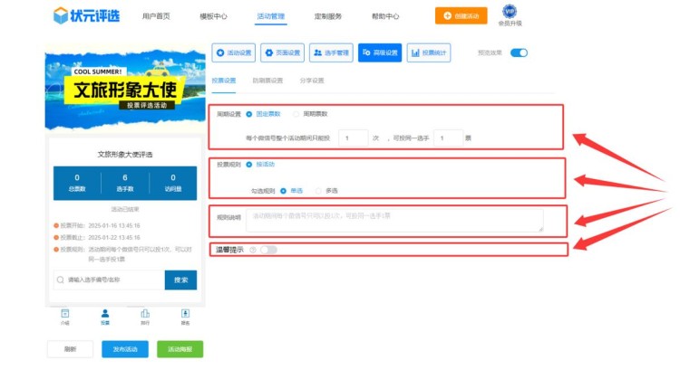 第三步,在【活动设置】中,将活动名称改为文旅形象大使评选,并设置活动起止时间、编辑活动介绍。