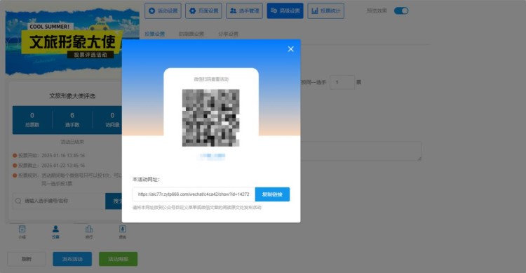 第七步,点击【发布活动】,系统会自动生成投票链接和二维码。这样文旅形象大使微信投票评选活动就制作完成了,您学会了吗?