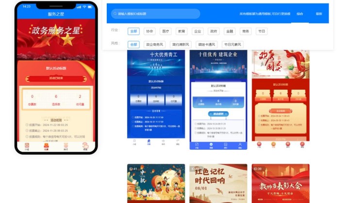 第二步,登录后,系统会自动跳转至活动后台,在【模板中心】,选择合适的模板样式,如知识产权十大事件、创业之星等。