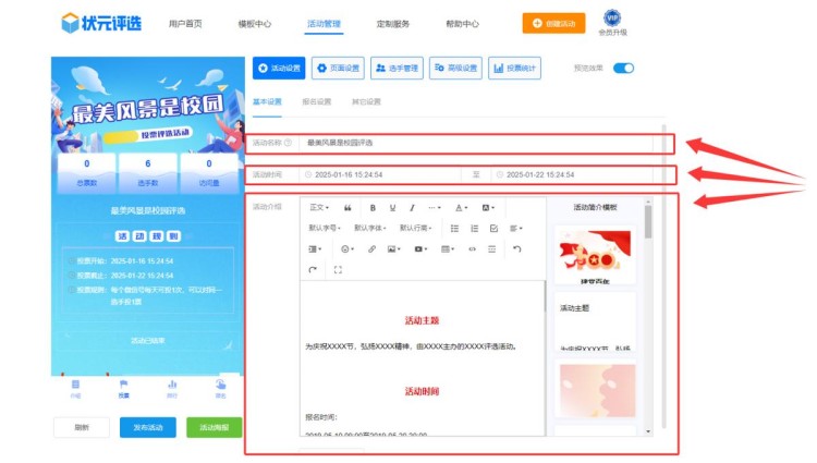 第三步,在【活动设置】中,修改活动名称、设置活动时间、编辑活动介绍。