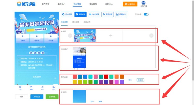 第四步,在【页面设置】中,上传主题轮播图,并根据轮播图的颜色,来调整配色方案、更换背景图片等。