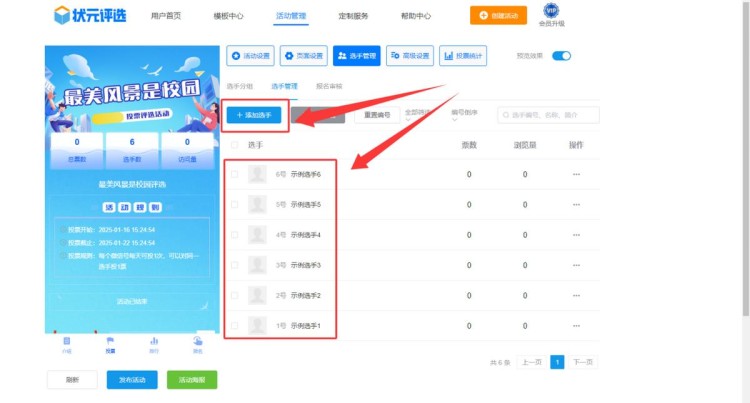 第五步,在【选手管理】中,上传所有选手的个人资料,包括选手的名称、简介、照片或者视频等。