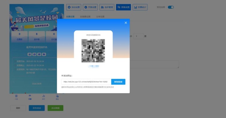 第七步,上述步骤完成,且仔细检查确定没有问题后,点击【发布活动】,系统会自动生成投票链接和二维码。这样一场微信投票小程序就制作完成了,是不是很简单?