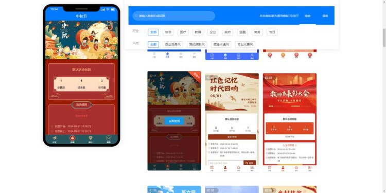 第二步,登录后,系统会自动跳转至活动后台,在【模板中心】,可以看到丰富的模板样式,选定后一键套用。