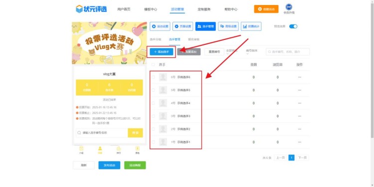 第五步,在【选手管理】中,上传所有选手的个人资料,包括选手的名称、简介、照片或者视频等。