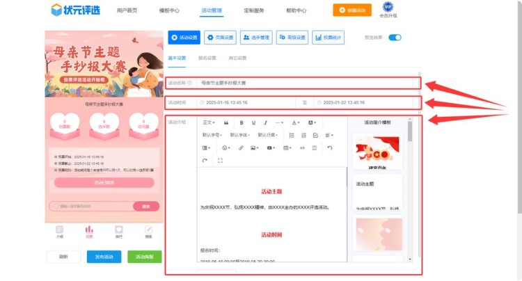 第三步,在【活动设置】中,修改活动名称、设置活动时间、编辑活动介绍(包括活动名称、时间、评选标准、奖项设置等)。