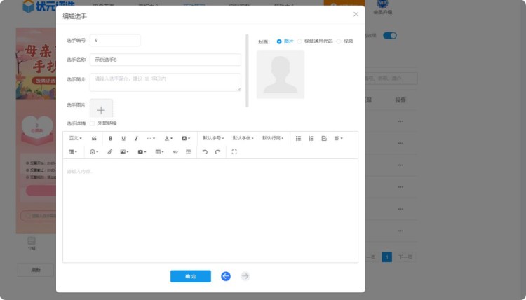 第五步,在【选手管理】中,上传所有选手的个人资料,包括选手的名称、简介、照片或者视频等。