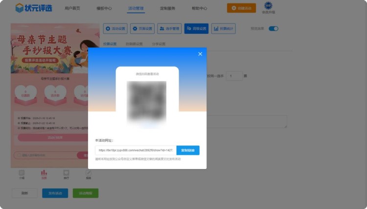 第七步,点击【发布活动】,系统会自动生成投票链接和二维码。将其保存下来并分享出去,即可开启投票评选活动。这样一场与母亲节相关的微信评选活动就制作完成了,您学会了吗?