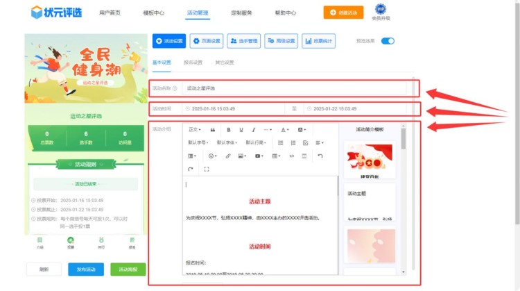 再者,在【活动设置】中,编辑活动信息,包括活动名称、时间、简介。
