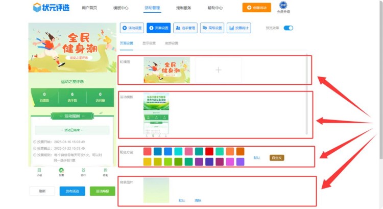 接下来,在【页面设置】中,上传主题轮播图,并根据活动需要,完成其他页面设置上的操作,如添加背景音乐、漂浮物等。